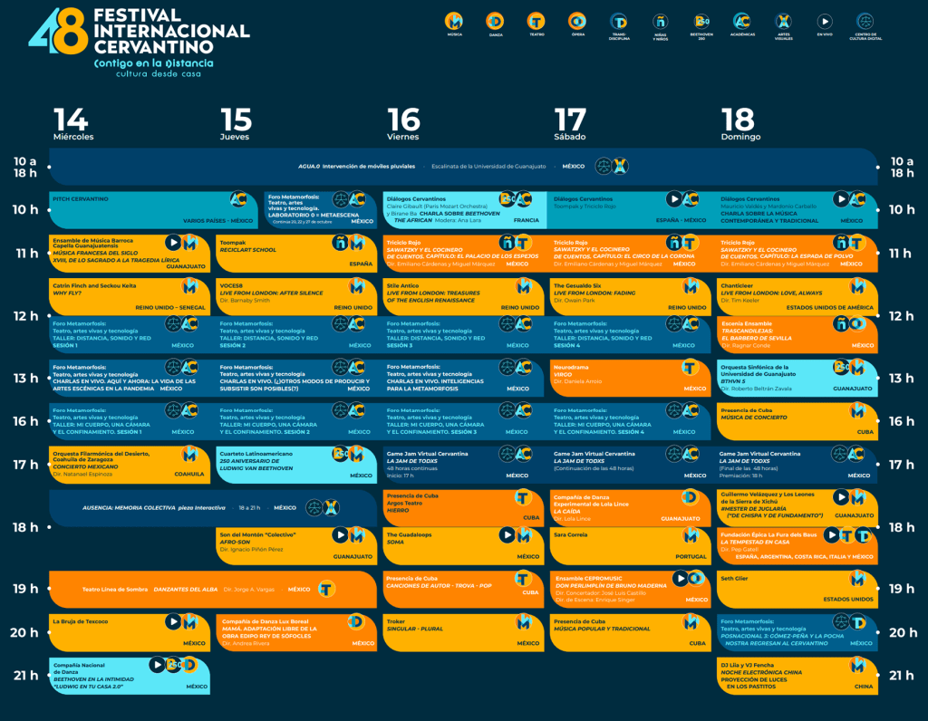 El Festival Internacional Cervantino (FIC) lleva a cabo su 48 edición de forma digital por primera vez en su historia, del 14 al 18 de octubre, dicha transmisión será gratuita y completamente en vivo a través de sus redes sociales en Facebook, Twitter, Instagram, Youtube, Spotify y Tik-Tok.