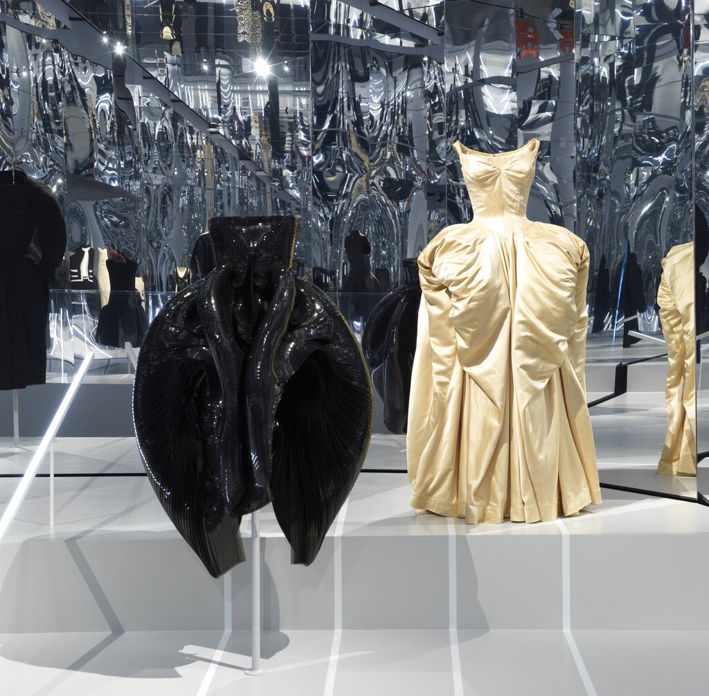 El diseño de la muestra busca expresar el funcionamiento interno y externo de un reloj. Hay dos relojes, dos galerías y dos líneas del tiempo. Una es cronológica, comienza en 1870, cuando se fundó el museo (que este año llega a su 150 aniversario). La otra es lo que Bolton califica como “una línea del tiempo interrumpida de la moda” que involucra saltos en el tiempo hacia atrás y hacia delante o “interrupciones”.