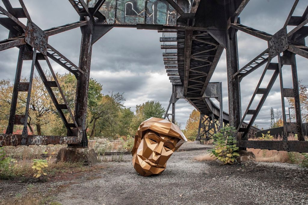 No es una cabeza hiperrealista, sino “brutalista, muy severa y geométrica”, con la que subraya todavía más el símbolo. No solo cae Trump, sino todo lo que representa.