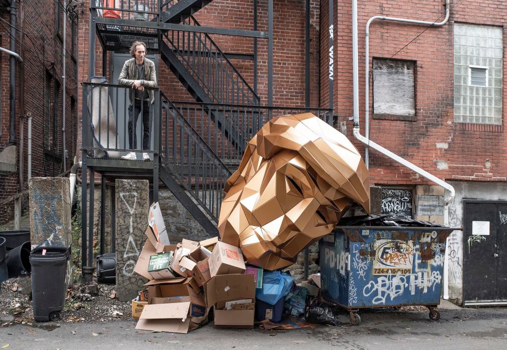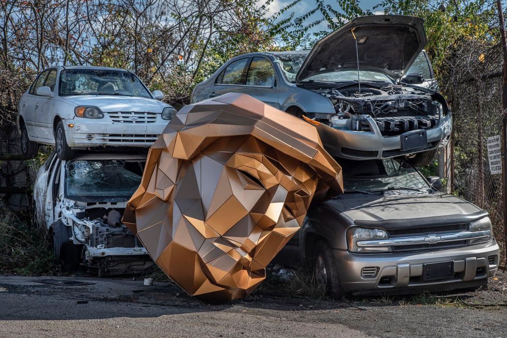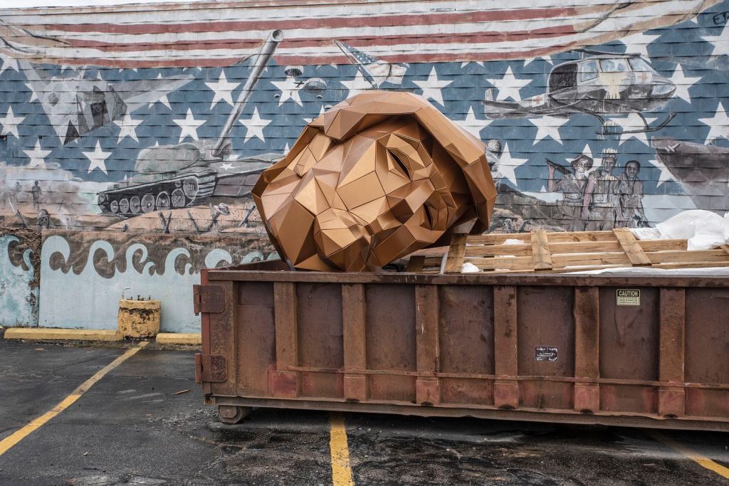 El artista ha realizado una estatua de la cabeza de Trump de casi dos metros de plástico y la ha ido colocando en contenedores de basura, cementerios de automóviles y depósitos de chatarra, “porque quería hacer una declaración política”.