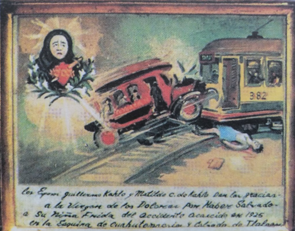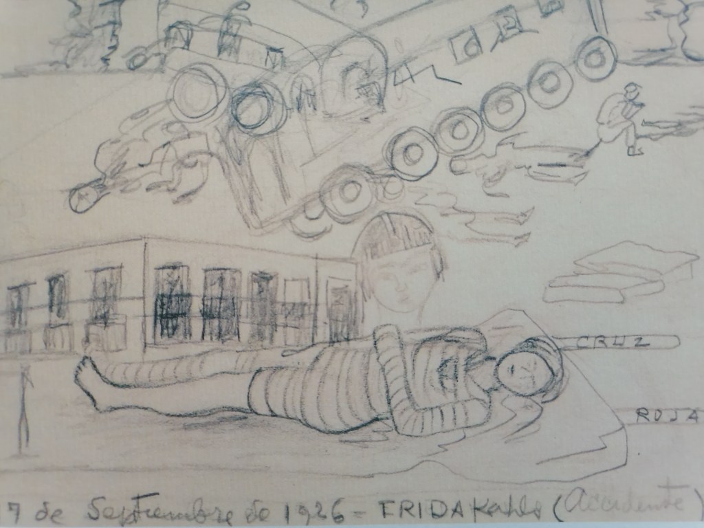 Un día, Frida y Alejandro iban en el autobús, cuando un tranvía chocó contra ellos. Frida resultó gravemente herida. Nadie en el hospital creyó que sobreviviría. Estuvo internada un mes antes de poder volver a su casa.
