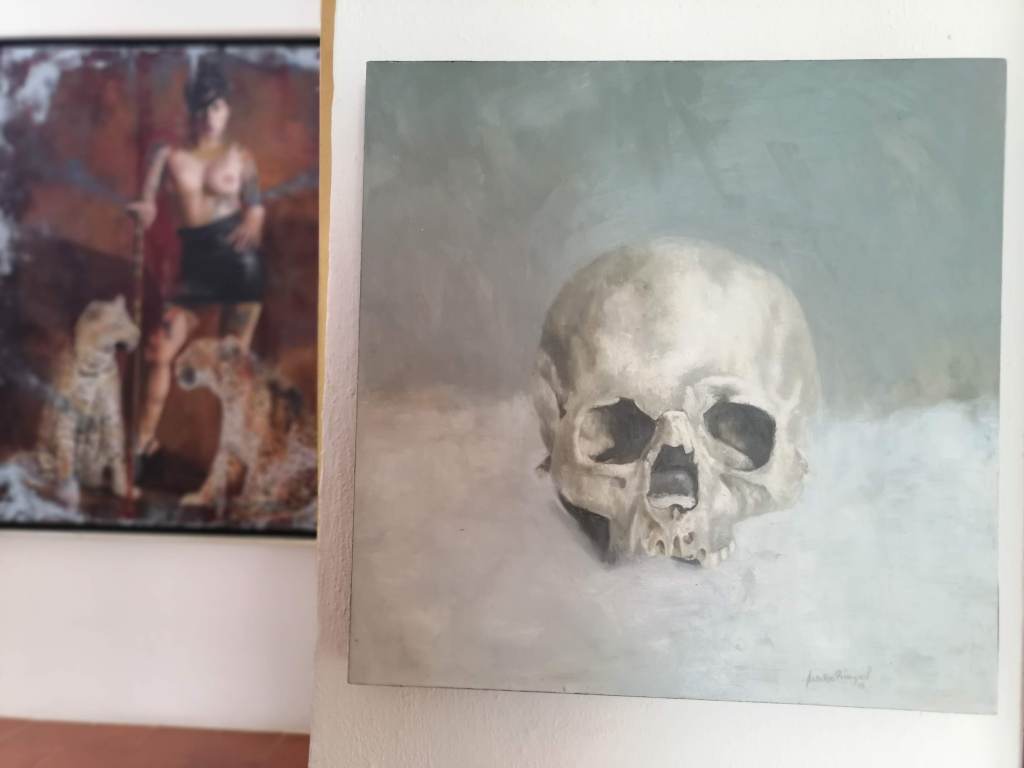 Hay otras que no necesariamente están relacionadas con los mitos, sino más bien parten de una reflexión propia, tienen que ver con el tiempo. A mi me intriga mucho ese tema de cómo transita el tiempo en la vida misma, cómo somos cíclicos y tenemos -en cuestión de materia por lo menos- un principio y un fin. De ahí, caigo mucho en elementos que ocupo mucho para complementar las composiciones de la obra porque, regularmente, la figura humana es el eje central, el personaje principal, pero de ahí empiezan a surgir otros elementos alrededor que completan el diálogo, la metáfora, en la misma obra. Y después, el que cierra el candado es el espectador. Volviendo al tiempo, recurro mucho a los cráneos. Desde mi punto de vista, el cráneo es un elemento de permanencia: cuando el resto de la materia -principalmente en los seres humanos, o de cualquier animal- ya no existe, el hueso sigue quedando. Ese es en mi obra el significado que tiene este elemento. Voy jugando con estos pretextos para generar una idea que termina conformándose en los cuadros como los vemos.