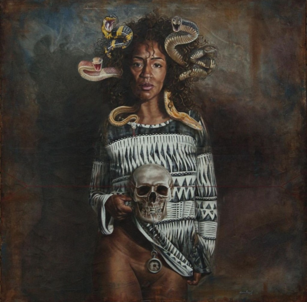 Después, cuando estaba empezando a hacer la figura humana y a arriesgarme a lo que yo quería pintar, tuve la gran fortuna de conocer y trabajar con el maestro Rafael Cauduro. Entonces, eso fue otro parteaguas en mi carrera. Yo conocía su trabajo por imágenes, pero no tenía el gusto y el honor de conocerlo en persona. Y cuando comenzó a hacer el proyecto de los murales de la Suprema Corte de Justicia, tuve el privilegio de formar parte de su equipo durante todo el proceso, que fueron tres años. Y eso, obviamente, me llevó a ver otro panorama en la pintura, en la producción, a entender más los materiales, a salirme de lo institucional, del cómo pintar, a llegar a una metodología más arriesgada y suelta, fuera de las academias. Eso generó otro parteaguas en mi producción que me tardé en arropar en mi obra, en hacer parte de mi obra, debido a que está muy cerca el vínculo entre Rafael y yo, y mucha gente cree que somos muy parecidos en cuanto a producción, pero en realidad, hay muchas diferencias.