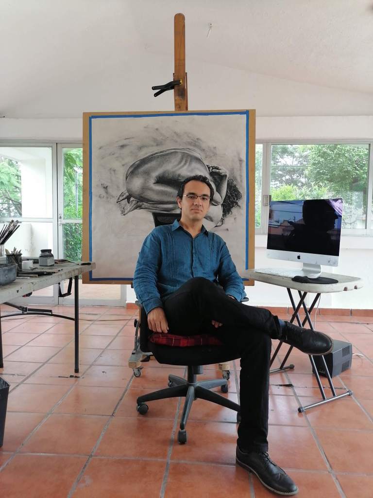 De ahí, derivé a hacer pintura en forma y a arropar mi carrera como productor artístico, como pintor específicamente. Y ese es un primer cambio: pasé a lo políticamente correcto en ese momento. En un principio las temáticas no eran las que abordo ahorita… Siempre me llamó mucho la atención la figura humana, pero no eran los mismos temas al inicio, eran muy de entender los materiales y de aprender. Entonces, de alguna forma, no había un lenguaje propio; era como mucha búsqueda porque se trataba de aprender. Ya después fui encontrando mi tema: la figura humana.